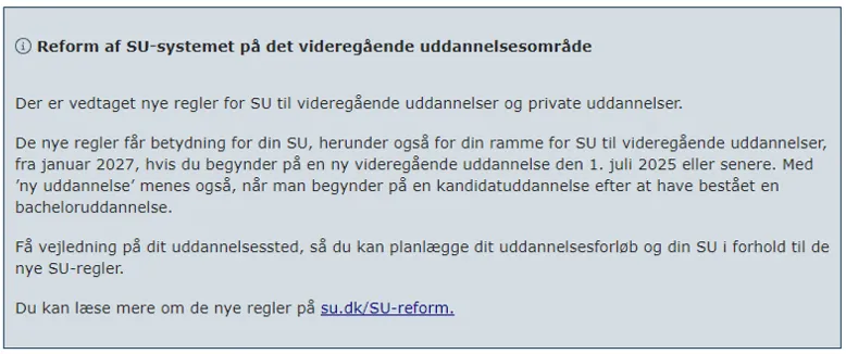 Du finder tidspunktet for, hvornår du er startet på din igangværende videregående uddannelse i minSU under Mine uddannelsesforløb. Er du startet på en ny videregående uddannelse i juli 2025 eller senere, bliver din SU til uddannelsen omfattet af de nye regler i januar 2027.